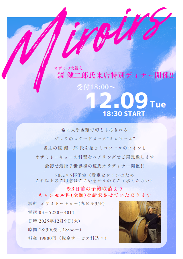 ジュラのトップ生産者ドメーヌ・デ・ミロワールの当主・鏡健二郎氏を迎えて、オザミトーキョーにてメーカーズディナーを開催致しました!